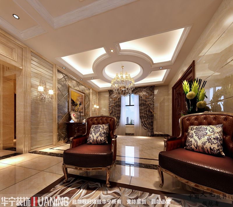 歐式裝修強調(diào)以華麗的裝飾、濃烈的色彩、精美的造型達到雍容華貴的裝飾效果。歐式客廳頂部喜用大型燈池,并用華麗的枝形吊燈營造氣氛。門窗上半部多做成圓弧形,并用帶有花紋的石膏線勾邊。入廳口處多豎起兩根豪華的羅馬柱,室內(nèi)則有真正的壁爐或假的壁爐造型。墻面最好用壁紙,或選用優(yōu)質(zhì)乳膠漆,以烘托豪華效果。