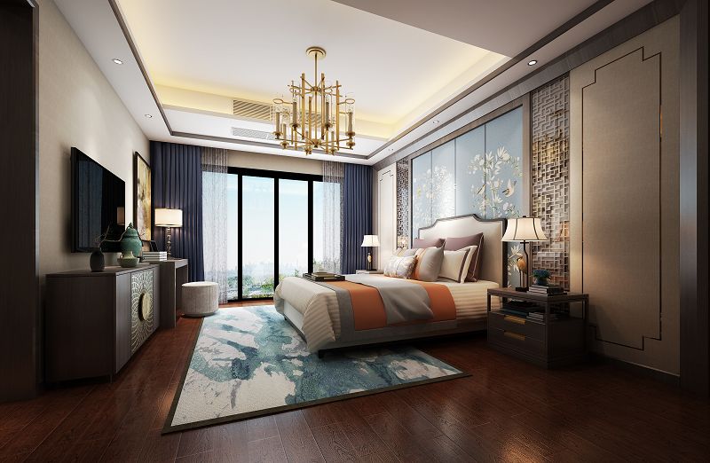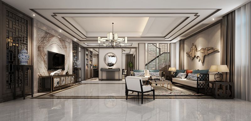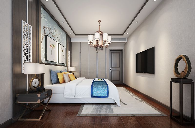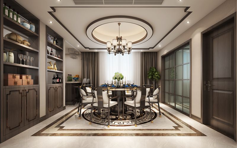 客廳整體以沉穩(wěn)的灰褐色為主,局部點(diǎn)綴祖母綠和帝國黃,配以簡潔內(nèi)斂的家具燈飾,如同棋盤散開的地毯呼應(yīng)整個空間的色彩對比。以蝴蝶實(shí)物畫為背景,頂部以黑鋼勾邊,優(yōu)雅又不失靈動,為餐廳營造了時尚精致的用餐氛圍。頂面和地面的線條采用中式傳統(tǒng)的上下對稱設(shè)計手法,遙相呼應(yīng),平衡和諧。中式水墨畫竹葉元素的床品,構(gòu)建出典型的東方語境,呈現(xiàn)了書香之家獨(dú)有的氣質(zhì)。