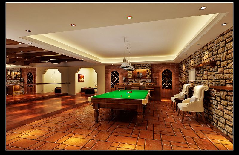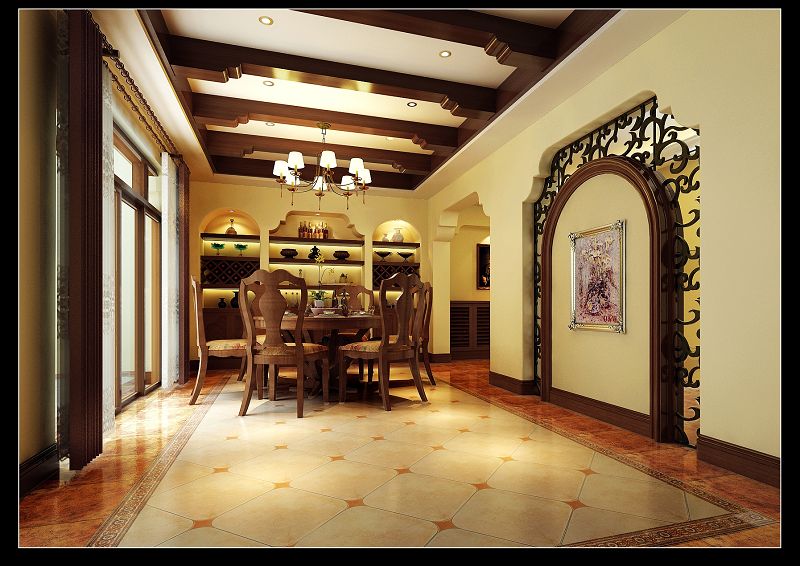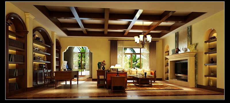 通過入戶花園進(jìn)入室內(nèi),就是寬達(dá)7米的客廳。45度斜角的米黃色石材、用防古磚分隔形成的地面拼紋,與頂棚井干式穿插的木梁對(duì)應(yīng)起來,視覺上感到和諧而穩(wěn)定。墻面居中的位置是一個(gè)美式壁爐,對(duì)面的壁龕特別引人注意:米黃的肌理漆,還出現(xiàn)在主人房的背景墻上。