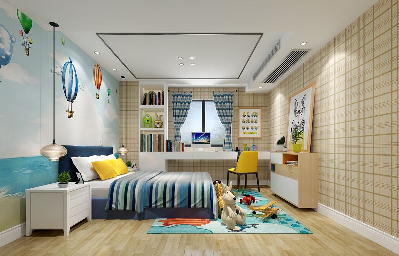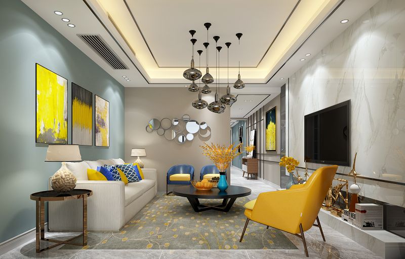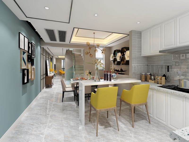 本案以作為現(xiàn)代時尚風(fēng)格,地面采用了現(xiàn)在比較流行的高級灰地磚,電視墻采用爵士白大理石,開放式廚房及吧臺搭配黃色的吧椅為整個空間增添了不一樣的生機(jī)。臥室無主燈設(shè)計及定制墻畫給兒童增添了成長快樂。