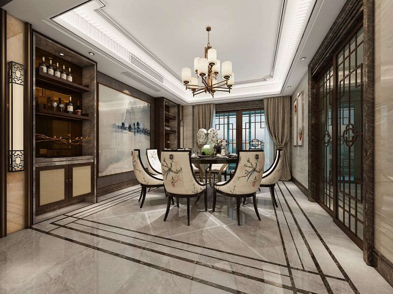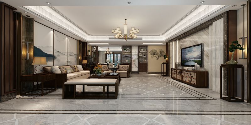 本案一白色、米色為主調(diào)搭配出一個和諧優(yōu)雅的居住空間,高低起伏的曲線虛實對比勾勒出大氣又時尚的空間,局部用山水潑墨畫點綴,使得整個空間年輕有活力。