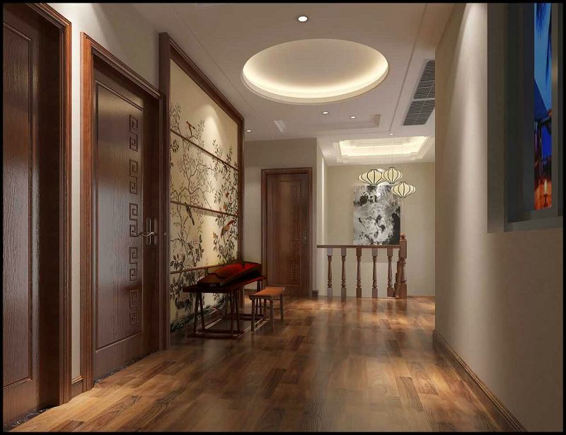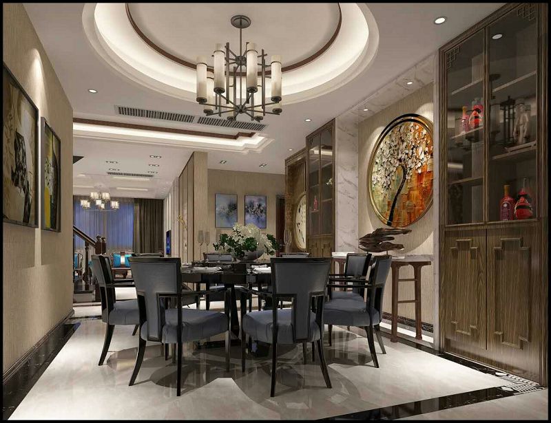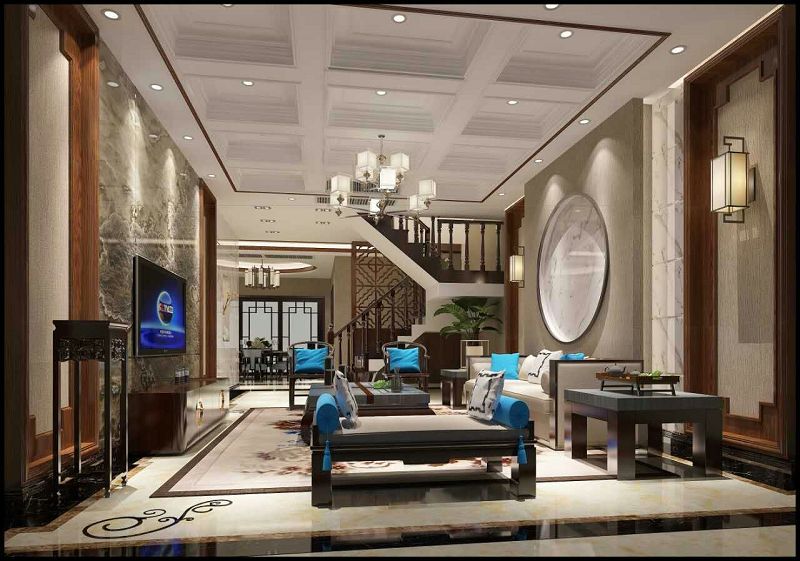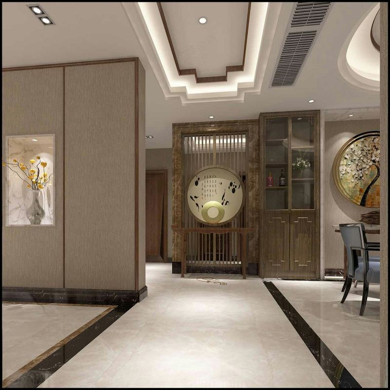 設(shè)計(jì)思路:本案為新中式風(fēng)格。入戶玄關(guān)設(shè)計(jì)用木制隔斷讓玄關(guān)顯得大氣沉穩(wěn)??蛷d以傳統(tǒng)的中式顏色為主調(diào)用藍(lán)色來點(diǎn)亮整個(gè)空間的層次和韻味,讓人有一種心如止水的感覺。地面運(yùn)用拼花地板和石材搭配,讓地面形成一副畫融入到整個(gè)場(chǎng)景中。