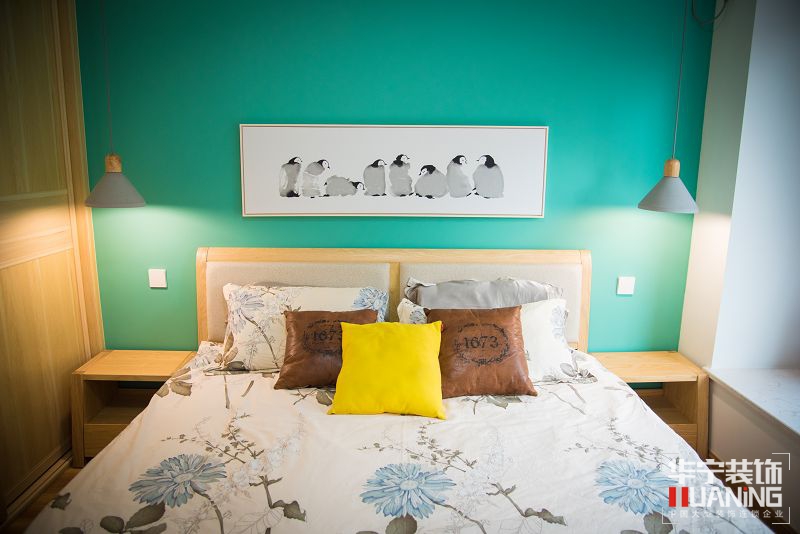主臥室里的刺繡花紋軟配是設(shè)計(jì)中的又一亮點(diǎn),有質(zhì)感的落地窗簾,都采用了純白色作為主要顏色,配以“薄荷綠”床頭背景墻漆,詮釋了保持對(duì)生活美好的事物一種期待的心情。