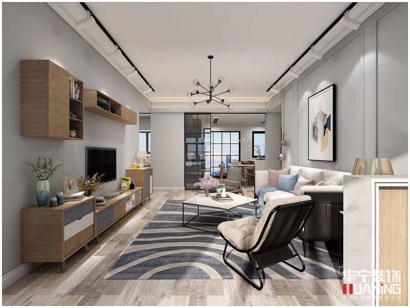客廳,用了白色的天花板,采用極簡的黑色線條勾勒,搭配極其簡約的吊燈簡單而不失單調。墻壁四周采用淺藍色,搭配掛畫與木質墻柜,帶著一股清新質樸的味道。