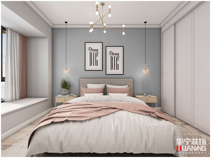 臥室,墻面依舊采用淺藍色,淺木色的沙發(fā)搭配樸素的床單,在簡約吊燈的照耀下,盡顯清新有格調。