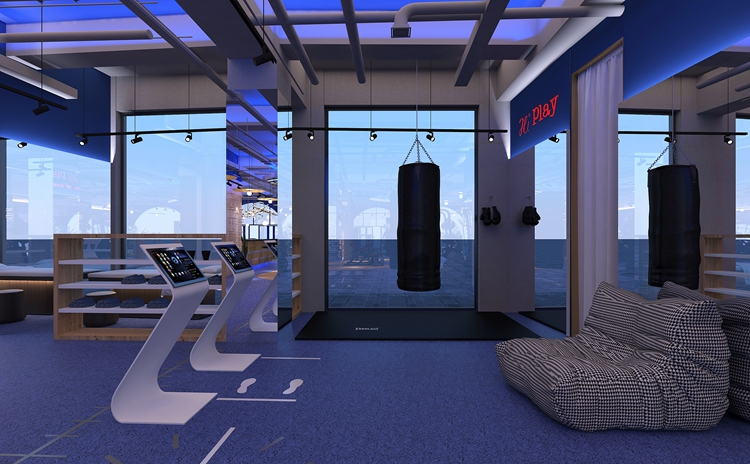 上海健身會所設(shè)計打破傳統(tǒng)觀念試圖通過藍(lán)色與紅色的對比,直線與曲線的對比來描述現(xiàn)代女性陽剛獨立的一面。健身房不只是男士的領(lǐng)域,女性同樣擁有力量。