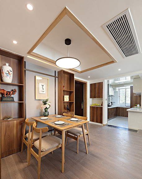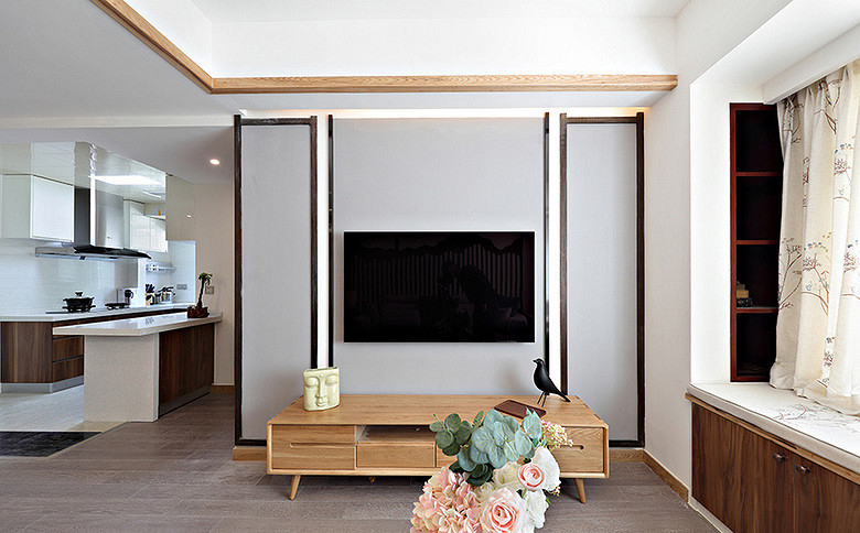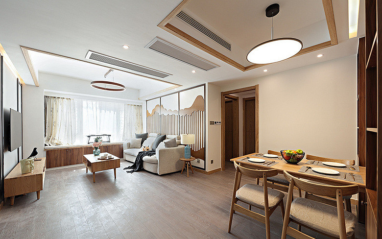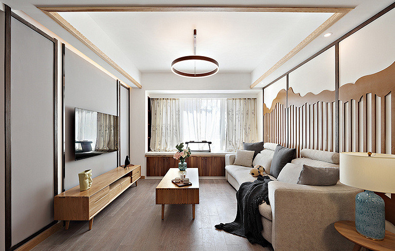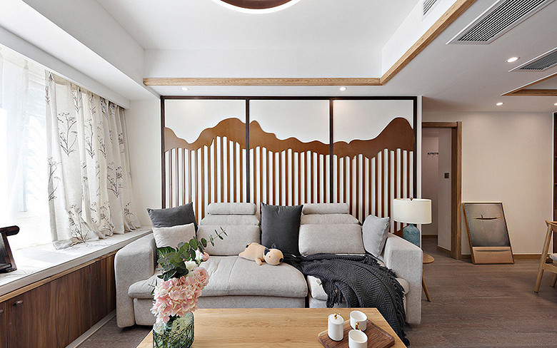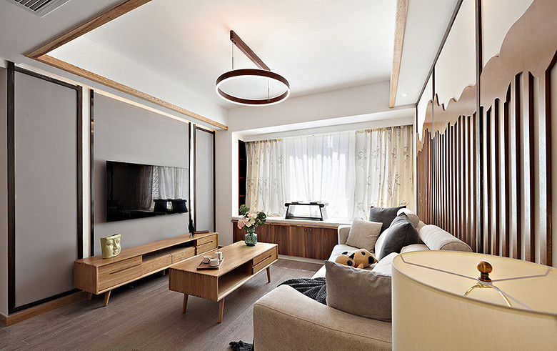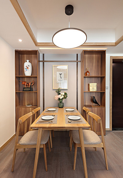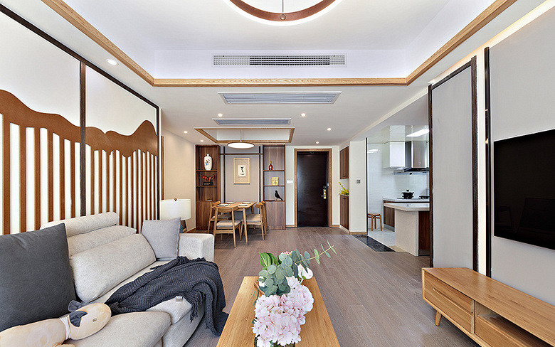 本案例面積102平米,戶型為三居室,裝修風格為新中式風格,在現(xiàn)代裝修風格中融合進了傳統(tǒng)家居的精華元素,既古典又時尚。