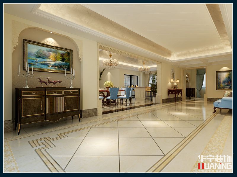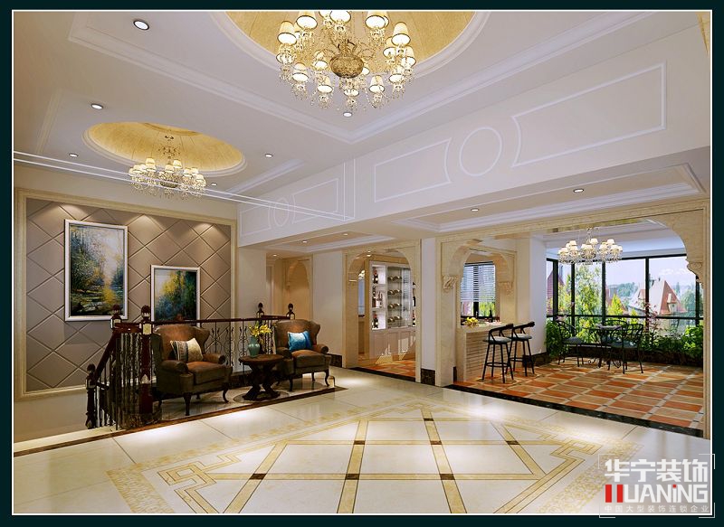 本案設(shè)計突破了慣用歐式繁雜的設(shè)計方法,用雅致色彩對比的裝飾手法進行整個設(shè)計貫穿,特別是地磚拼花造型的運用,使得整個空間簡約而不簡單;在加上新型環(huán)保材料硅藻泥的運用,讓空間顯得更加簡潔而雅致。還有門廊、窗臺收邊等細節(jié)方面西班牙米黃大理石的巧妙運用,增添空間的韻味和層次感。