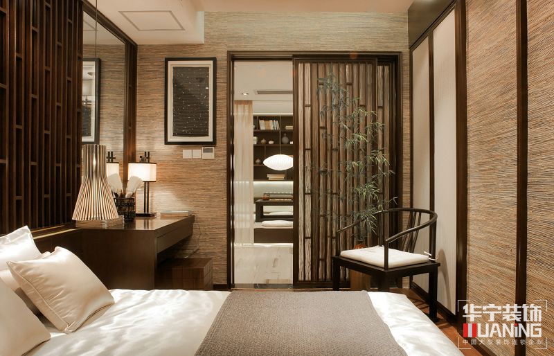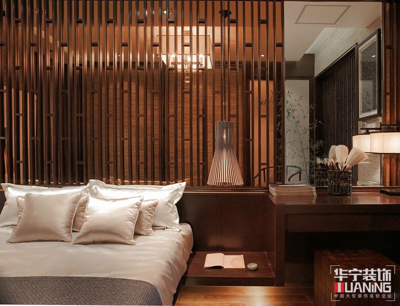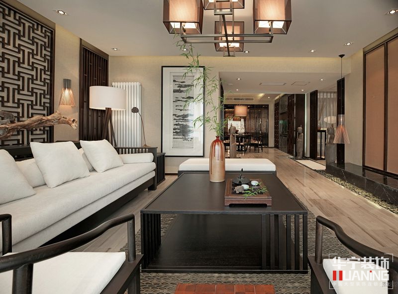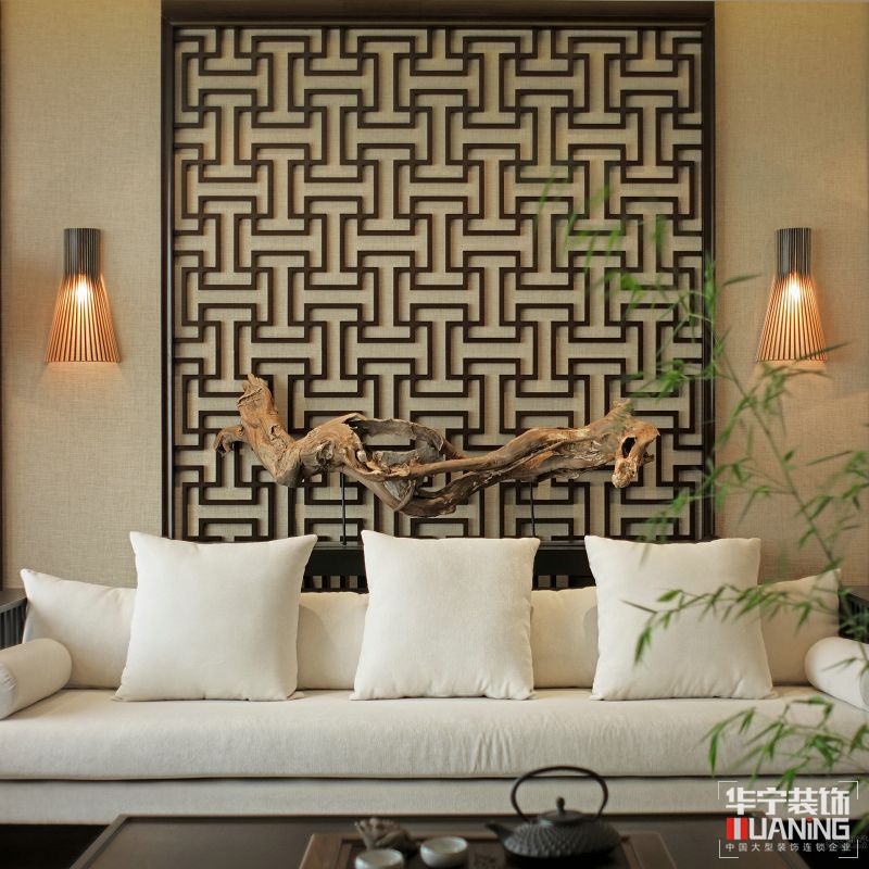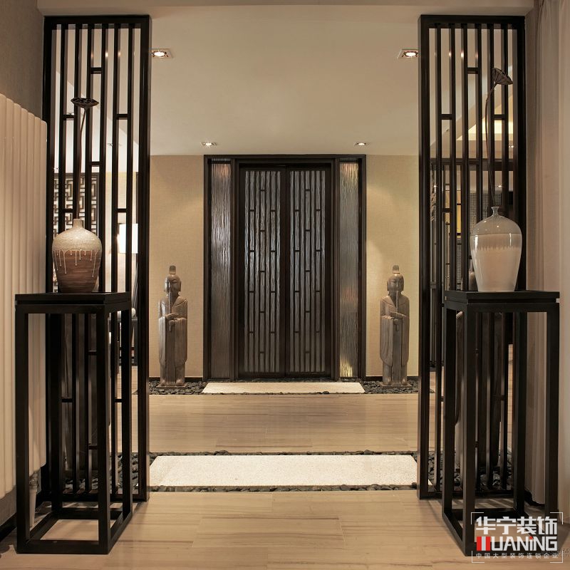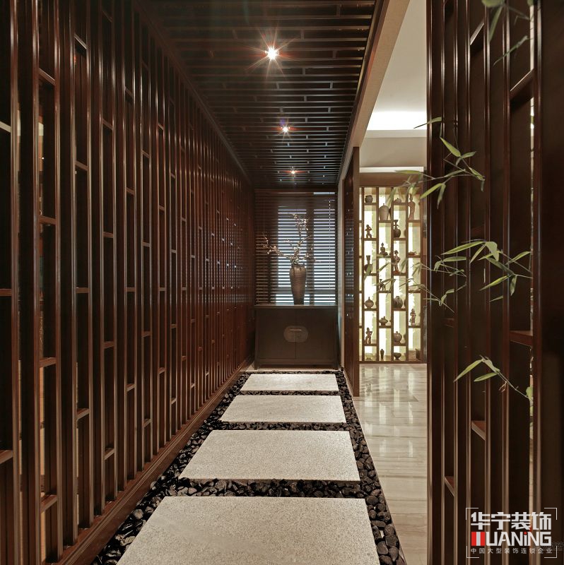 此項(xiàng)目樣板間就是設(shè)計(jì)師為提供給主人以修心養(yǎng)性、及收藏會友所量身定做的私人場所??臻g以傳達(dá)輕松、舒適、放松的氛圍為目的。推門而入,“綠竹入幽境,青蘿拂行衣”,這全靠兩旁的木質(zhì)格柵所營造出的氛圍。這個木質(zhì)格柵的設(shè)計(jì)靈感來源于竹子,設(shè)計(jì)了這種木質(zhì)格柵的樣式。腳底的踏石加上青嫩的竹葉、帶給人一種自然親切、平靜放松的感覺,悠閑、隨意的生活意境盡顯眼底,濃郁的東方禪意氣息隨之而來。