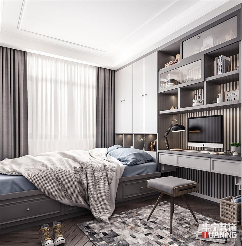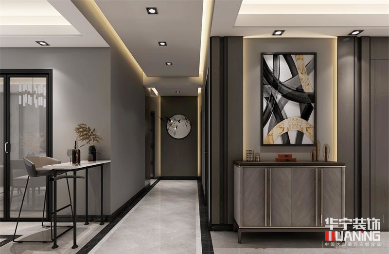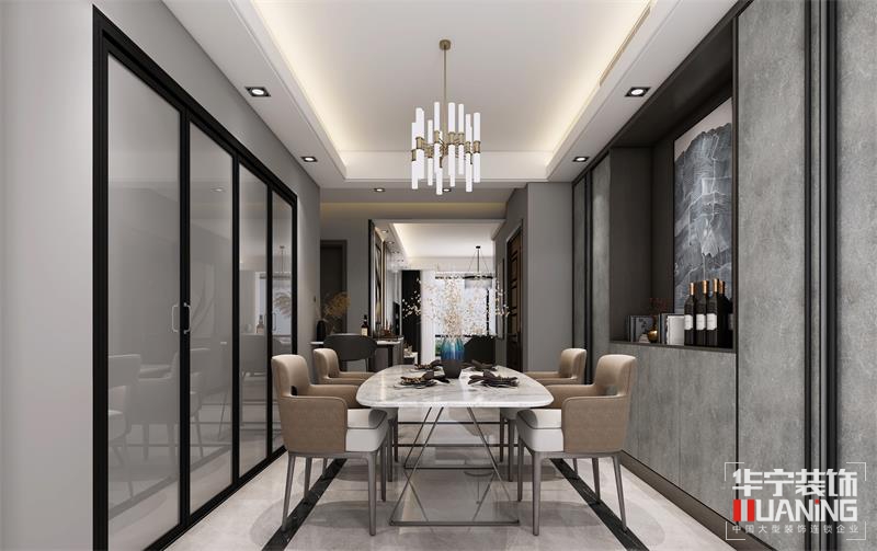 整體風格以高級灰作為一種格調(diào)色系,讓空間的高冷氣息與布藝、地毯、燈飾等元素,巧妙地弱化空間的清冷,使之變得更有趣味和溫度,凸顯出優(yōu)雅舒適的生活情調(diào)。在高冷與溫暖中造就一個詩意的存在!沙發(fā)背景墻面為整齊爽利的木飾面,整體設(shè)計內(nèi)嵌金屬飾條,裝飾柜結(jié)合藝術(shù)玻璃的鏡面反射、金屬擺件,不同材質(zhì)在同一空間中以其不同的肌理相互碰撞融合。