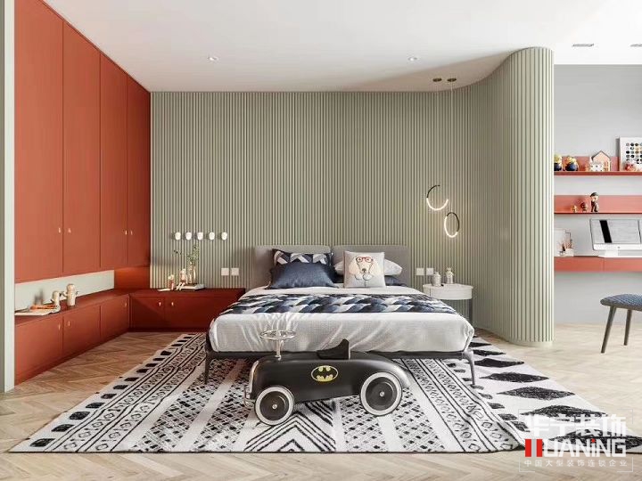 電視背景墻還做了部分開放層格來拓展收納,緊湊的淺藍(lán)色木格柵條排列與疏朗的深色巖板地臺巧妙結(jié)合,節(jié)奏清晰分明帶來變化的視覺體驗(yàn),柔軟細(xì)膩相互平衡,材質(zhì)的碰撞與融合,豐富空間層次,同時賦予空間高級質(zhì)感,明度上形成強(qiáng)烈對比,使空間質(zhì)感更顯硬朗簡潔干凈,進(jìn)而打破單調(diào)界限。