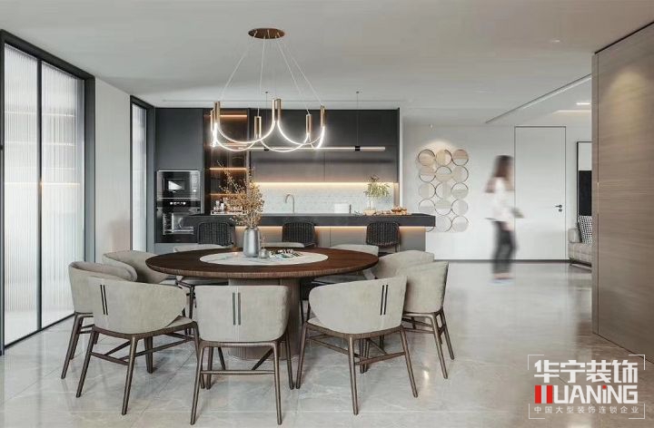 全開放的布局,整個客餐廳毫無阻隔,餐廳和客廳之間沒有隔墻,減少了兩個功能區(qū)的隔閡,增加了使用面積,同時也讓采光和通風(fēng)性得到了大大加強(qiáng)。無主燈的設(shè)計(jì),只在餐廳區(qū)域懸掛低垂的吊燈搭配暖光,營造良好的就餐氛圍。
