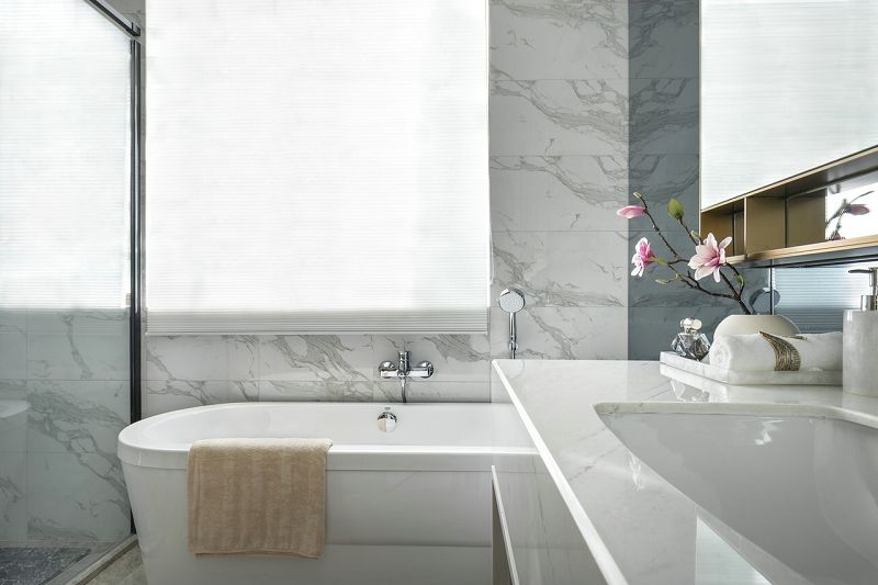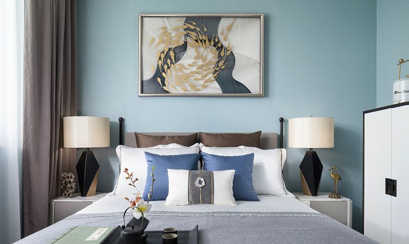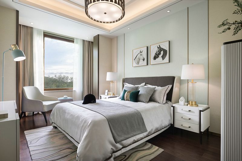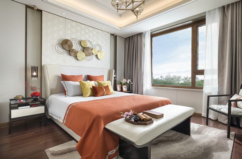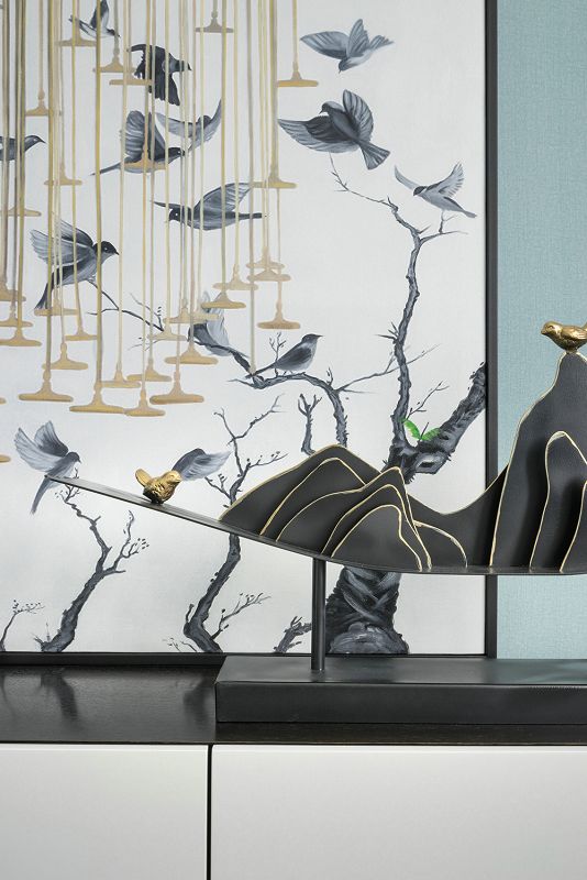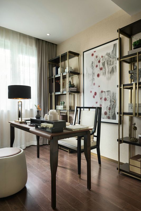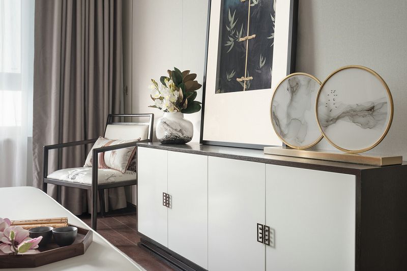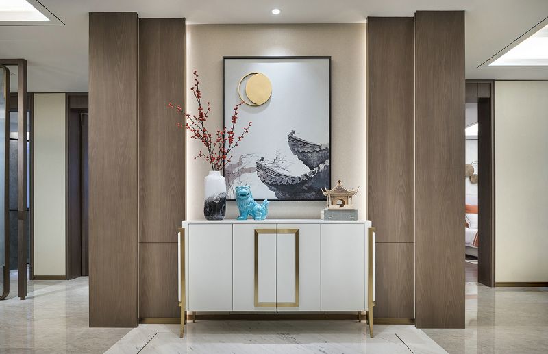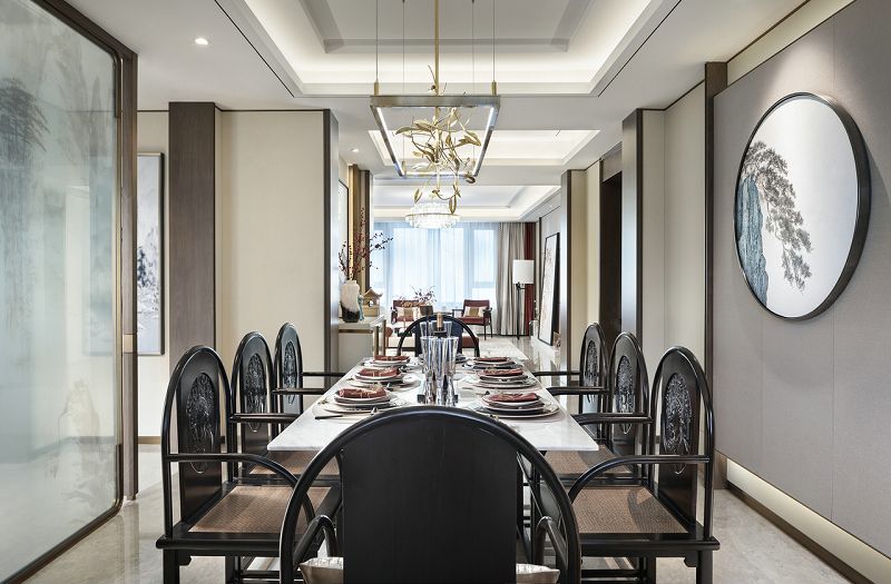 設(shè)計理念:步入空間,一幅古建筑闕角的畫作映入眼簾,與立體的木藝建筑擺件相映成趣,擔起空間的第一視覺落點。以豐富的色彩賦予玄關(guān)布局上的詩意,紅果點綴干枝,潑墨點染白瓷瓶,金黃圓月鑲嵌于畫幅,藝術(shù)的蘊涵與色彩的韻律交融一體??蛷d的設(shè)計引入了清雅醇和的中式美學(xué)意涵,以暖柿調(diào)糅合端莊雅正的金色,漸次落筆于扇子形制的藝術(shù)裝置、圓窗欞狀的陳設(shè)小品,描摹出大幅畫作上的銀杏葉脈絡(luò),搭配著古典設(shè)色的沙發(fā)與單椅,整體散發(fā)著“秋意濃”的悠遠意境。在這里,藝術(shù)的詩意與生活的意趣交融協(xié)奏,鏡面屏風的朦朧山水,與框住勁石蒼松畫卷的圓形墻面裝置意蘊相襯,精致的細節(jié)奏響空間氣質(zhì)的旋律。葳蕤繁茂的金色枝芽,環(huán)繞著餐廳的藝術(shù)燈飾,與當代工藝材質(zhì)造就的古典紋路花飾座椅一起,為空間注入更多清逸雅韻。