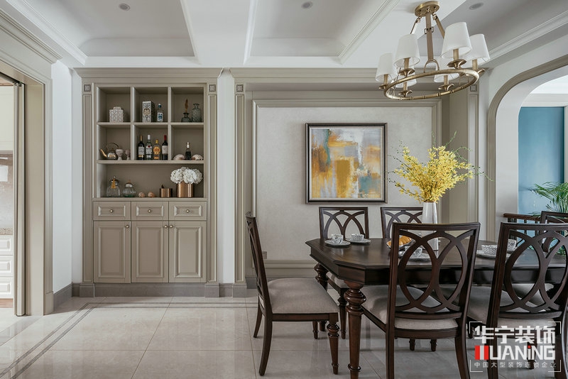 設(shè)計(jì)概念:一幅山水畫(huà)歸納了整個(gè)空間的色調(diào),海水的硅藻泥;健康的綠植盆栽;紅色的冬青;沉淀在棕色的家具上;從色彩、線條、布局上追求空間的靈動(dòng)性與品質(zhì)感;柔和而有質(zhì)感。餐廳選用具有現(xiàn)代抽象的掛畫(huà)以配合空間情調(diào),將現(xiàn)代的美式元素更加抽象化,揉入現(xiàn)代氛圍。