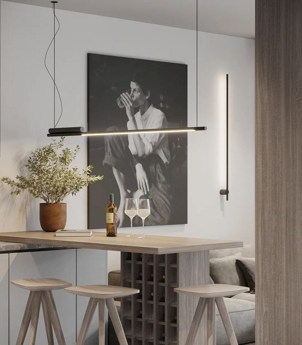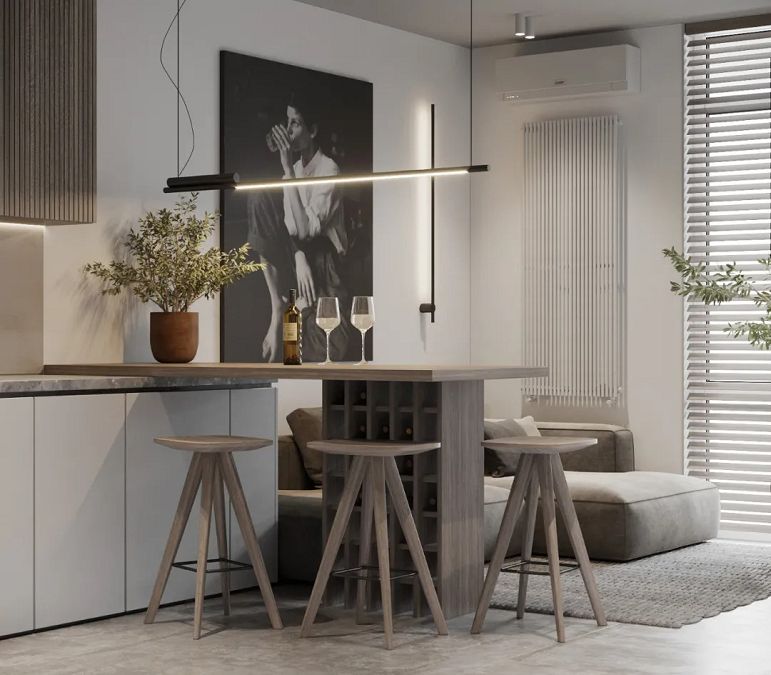從玄關(guān)開始就充分透露出極簡的筆觸,一凳,一畫,一樹在暖黃光線襯托下,治愈干凈的既視感。