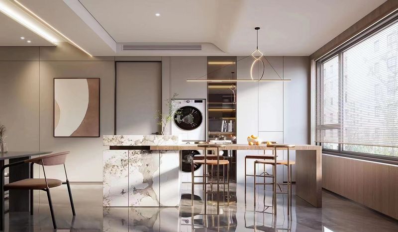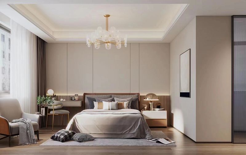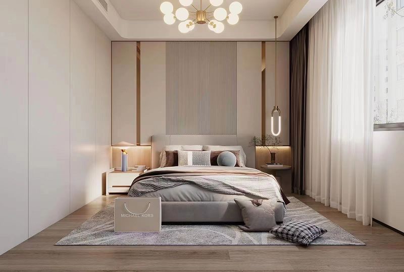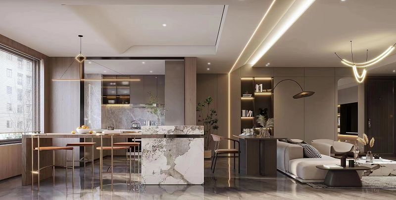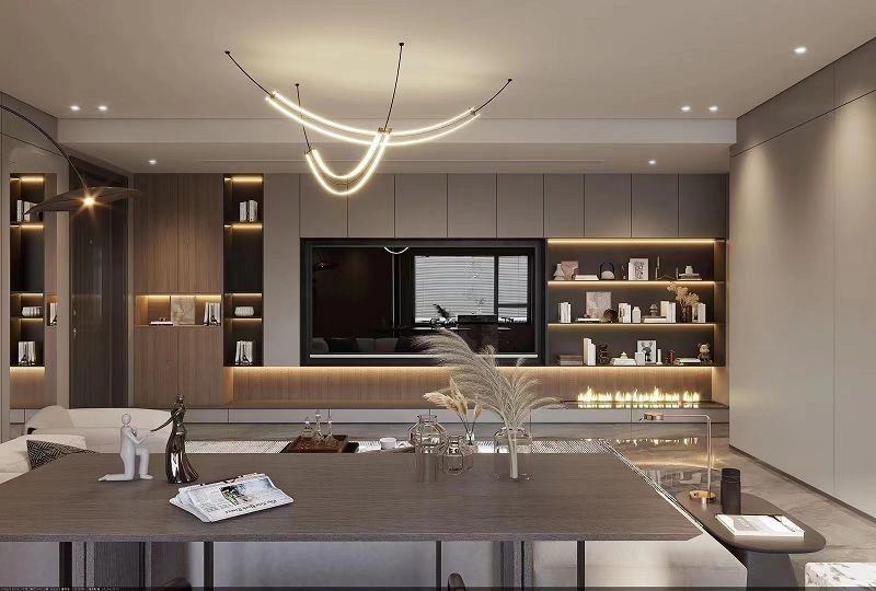 本案以作為現(xiàn)代輕奢風(fēng)格,其特征是注重硬裝的簡約,但又不像普通的極簡風(fēng)格那么隨意,在看似簡單的外表之下,往往體現(xiàn)出一種隱藏的高貴氣質(zhì)。使用少量的金屬,石材,和大面積木質(zhì)元素,再結(jié)合現(xiàn)代夸張的吊燈和線型燈的融入,使空間靈動(dòng),高級(jí),又不失溫馨。