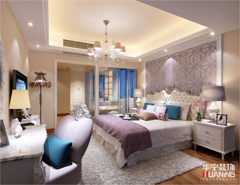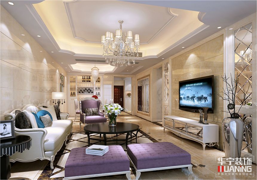 本案是位于惠州的大套房,整體以簡歐設(shè)計為主。主人是個要求浪漫個性,以紫色為主角加以搭配打造。客廳以歐式沙發(fā)、電視背景和天花組成。首先墻面以全房貼磚,背景墻以歐式線條,大理石,車邊鏡打造柔美,豪華的場景。天花以石膏線和圓形搭配。從而描繪出居室主人浪漫高貴的氣氛。