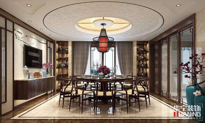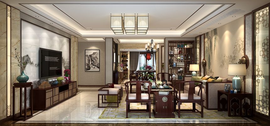 古老的東方文化在國際上的影響深遠,中式元素是本案的設計主題,同時也融合西方和現(xiàn)代時尚元素作為點綴。水墨花鳥的景象、天然的大理石和雕刻玻璃背景、紅木圈椅和山水紋大理石瓷磚的搭配及多種中式元素的結(jié)合,可謂是大俗大雅。