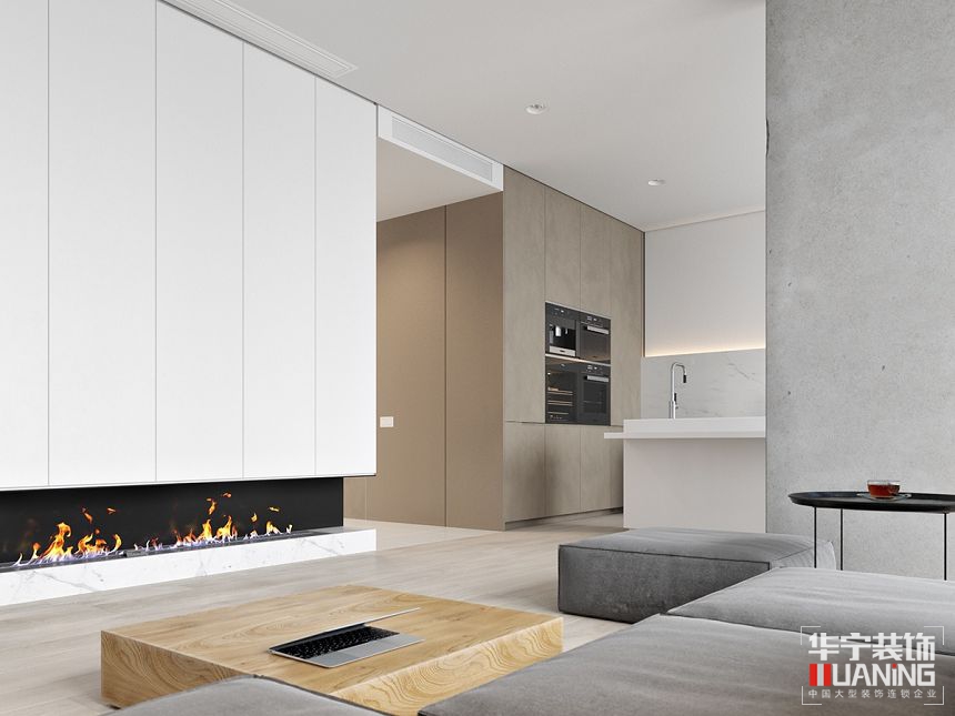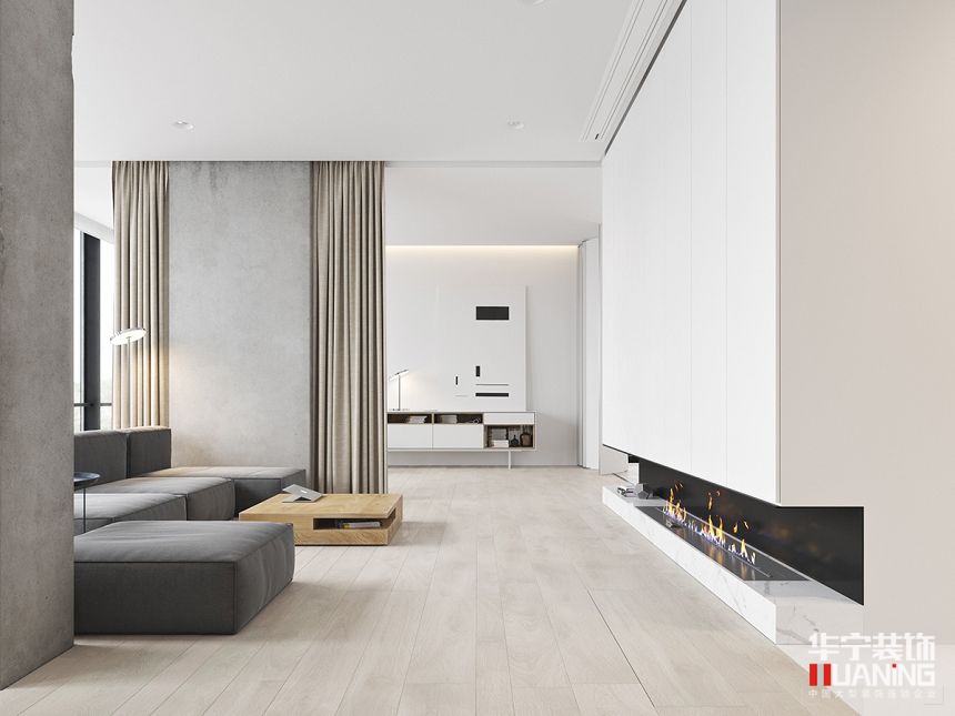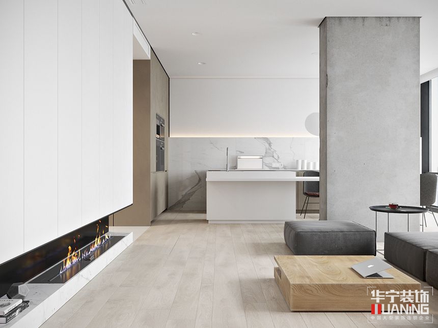 整個(gè)空間以白色調(diào)為基底,搭配淺灰色的沙發(fā),窗簾,在良好的采光下營造出透亮,潔凈的視覺感受,溫潤的木質(zhì)茶幾,熊熊燃燒的爐火成為溫暖空間的元素。 整個(gè)公共空間被劃分為三個(gè)區(qū)域,中央為客廳,一側(cè)為廚房,另一側(cè)則通過隔墻和窗簾形成獨(dú)立的閱讀時(shí),整排的置物柜,整齊的書籍,充滿線條感的座椅,獨(dú)特的裝飾品,都為這個(gè)白色空間增添生活氣息。