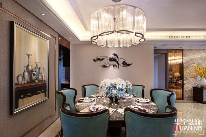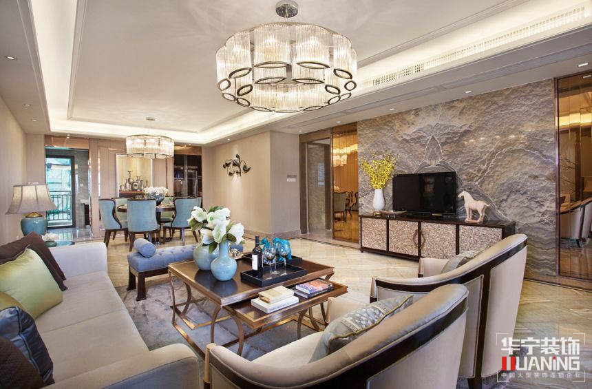 客廳與餐廳設計空間開闊明亮,雍容華貴。皮沙發(fā)及桌椅等,風格時尚現代,做工精致,又滲透著中式文化氣息。電視背景墻一塊獨特紋理的大理石造型,似塑造出一幅情景悠遠的中國古典山水畫作?;B屏風、中式燈飾,亦使中式韻味充盈空間的每一個角落。