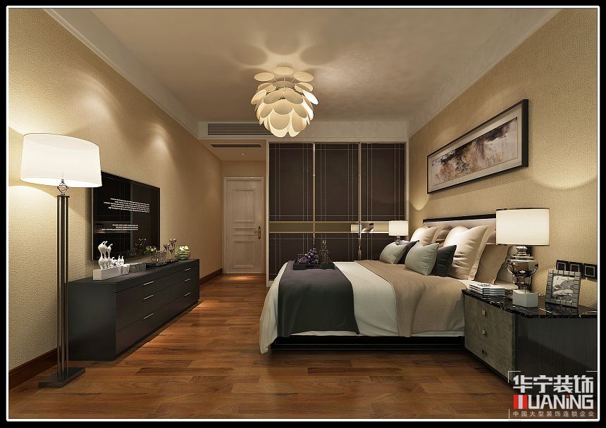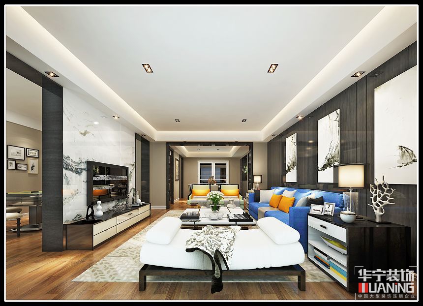 燈光上以漫反射的燈帶為主,均勻分布的燈光諧美、柔和,更能體現(xiàn)家的溫馨與舒適。在軟裝上適當點綴些歡快明亮的藍色、橙色與綠色,以及地面搭配木地板。這些細節(jié)上的設計都中和了黑、白、灰三色在視覺上帶來浚冷的感覺。整個空間無處不體現(xiàn)出溫馨與舒適、簡約與低調的奢華。