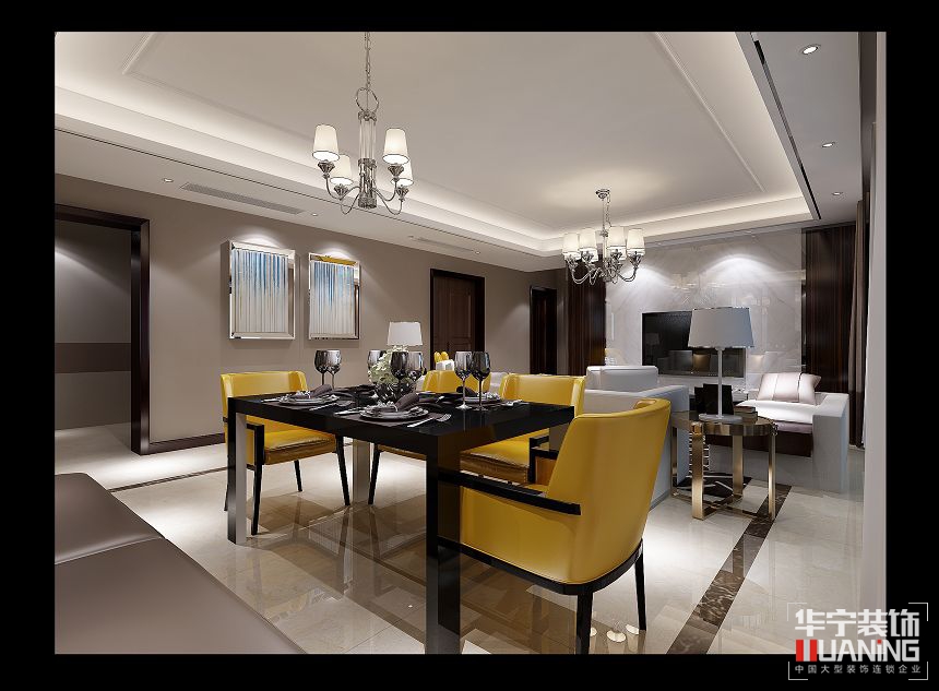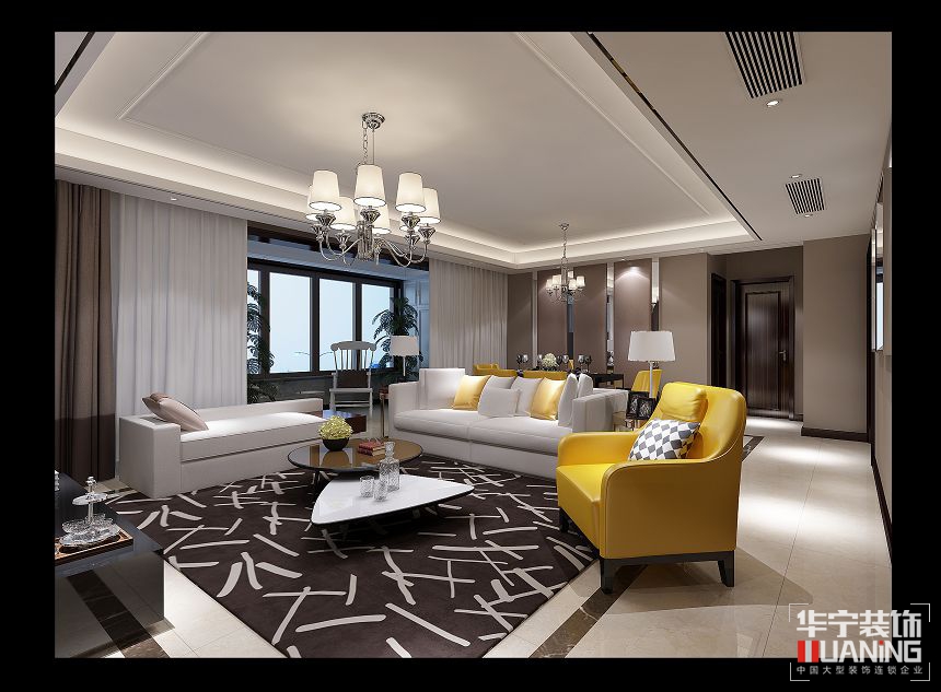 本案以冷靜的黑、白、灰色為空間主基調(diào),運(yùn)用充滿活力的黃色點(diǎn)綴空間。不同明度、材質(zhì)、質(zhì)感的黃色元素相互搭配,豐富了空間的色彩層次。簡單的吊燈,自然的花藝擺件,絲綢材質(zhì)的窗簾、靠包、餐墊等配飾相得益彰。沙發(fā)則是舒服的棉麻材質(zhì)。橫條幾何形地毯,強(qiáng)化黑白節(jié)湊的動(dòng)感主題。