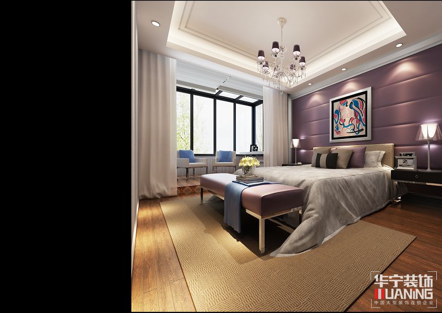 業(yè)主喜歡簡潔、純凈的東西,所以在色彩搭配以黑、白、灰色為主調(diào);但若單純以黑白灰呈現(xiàn),則太過于生硬,缺乏生活氣息,因此在局部又以軟包、窗簾、抱枕等明亮較高的紫色飾品作為點綴,瞬間豐富了整個空間。