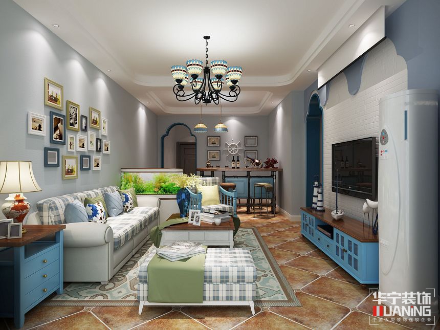 本案沿用的是地中海的色調(diào)與后現(xiàn)代鐵藝吧臺餐桌結(jié)合來營造年輕人對時尚的追求,同時也給人一種簡潔大氣的感覺。
