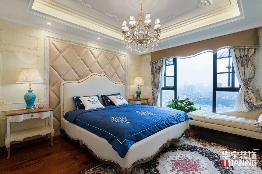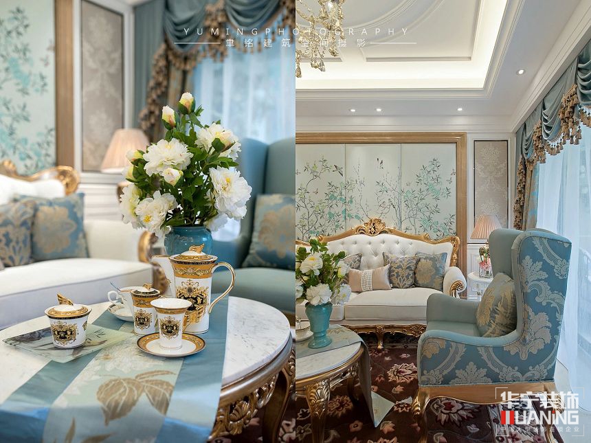 本案以強烈華麗的裝飾、精美的造型,達到雍容華貴的效果。墻面最好用壁紙、或選用優(yōu)質的乳膠漆,以烘托豪華效果。地面的材料以石材和地板為佳。色彩艷麗的布藝沙發(fā),都是客廳的主角,還有浪漫的羅馬簾。精美的油畫、制作精良的雕塑工藝品,都是點綴歐式風格不可缺少的元素。