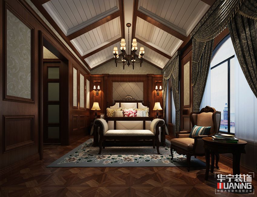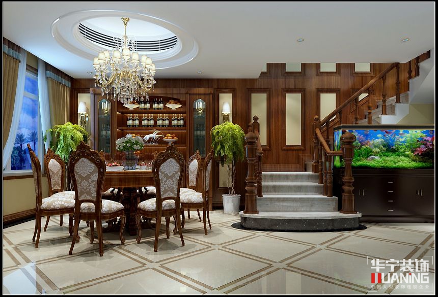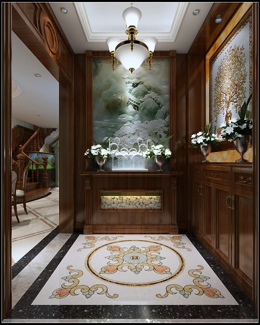 本案用材以實木護墻、微晶石地磚、玉石為主,體現(xiàn)美式風格的莊嚴和貴氣,并呈現(xiàn)美式生活的休閑和浪漫,在其文化氛圍的烘托下雕刻出精致與大氣并存。