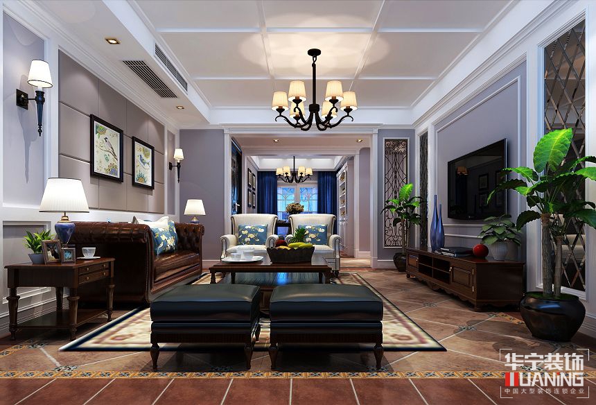 本案業(yè)主熱愛旅行,家庭和睦融洽,業(yè)主夫妻處于事業(yè)上升期,渴望放松休閑的居住氛圍,所以大面積運用簡單的淡藍色,遠離煩瑣的硬裝細節(jié),創(chuàng)造一種寧靜、簡潔的氛圍。本案風格定位為美式風格,以淺藍色為主色調(diào)。淺藍色給人以放松、靜謐的感官享受。環(huán)顧室內(nèi),墻面簡單地采用淡藍色為基底,充足的陽光從落地窗外照射進來,帶來了巨大的能量,讓生活更健康有活力;從居室內(nèi)空間的劃分、頂立面的造型設計,到空間的配色,家居軟裝的搭配擺放,都盡可能的自然隨意;一張相片、一幅畫、一個散落桌間的松果、一杯香茗,都讓業(yè)主感覺心在旅途,佳期如夢