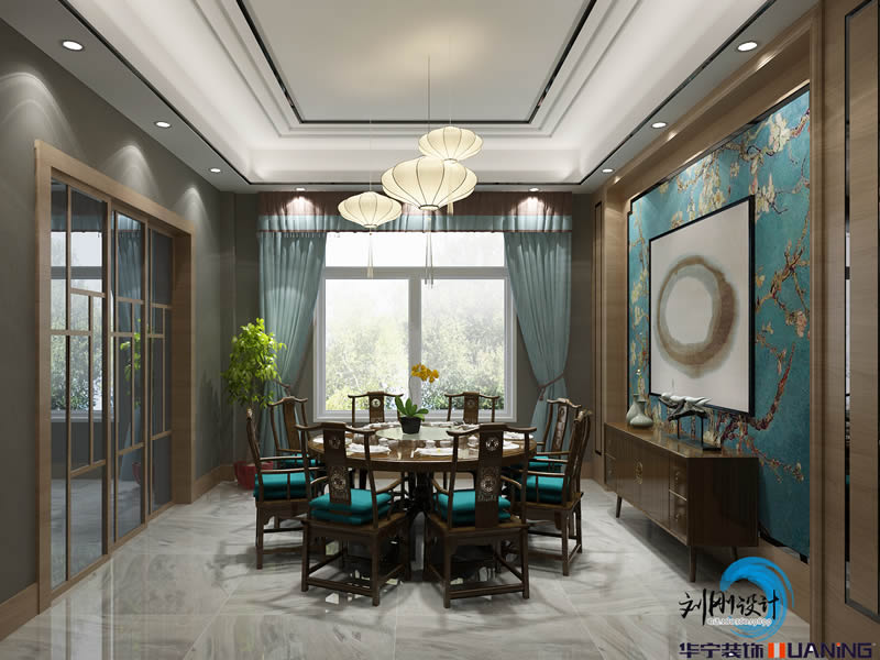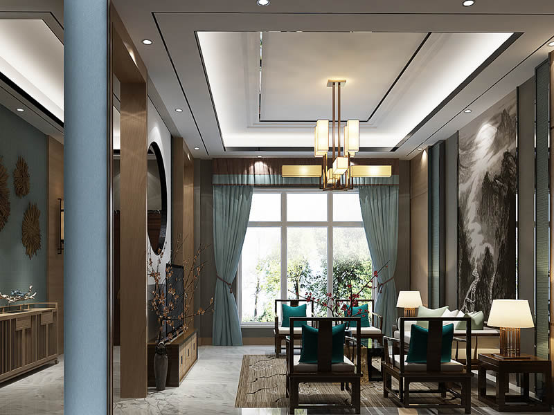 客廳整體以沉穩(wěn)的灰褐色為主,局部點(diǎn)綴祖母綠和帝國黃,配以簡潔內(nèi)斂的家具燈飾,如同棋盤散開的地毯呼應(yīng)整個(gè)空間的色彩對(duì)比。以蝴蝶實(shí)物畫為背景,頂部以黑鋼勾邊,優(yōu)雅又不失靈動(dòng),為餐廳營造了時(shí)尚精致的用餐氛圍。頂面和地面的線條采用中式傳統(tǒng)的上下對(duì)稱設(shè)計(jì)手法,遙相呼應(yīng),平衡和諧。中式水墨畫竹葉元素的床品,構(gòu)建出典型的東方語境,呈現(xiàn)了書香之家獨(dú)有的氣質(zhì)。