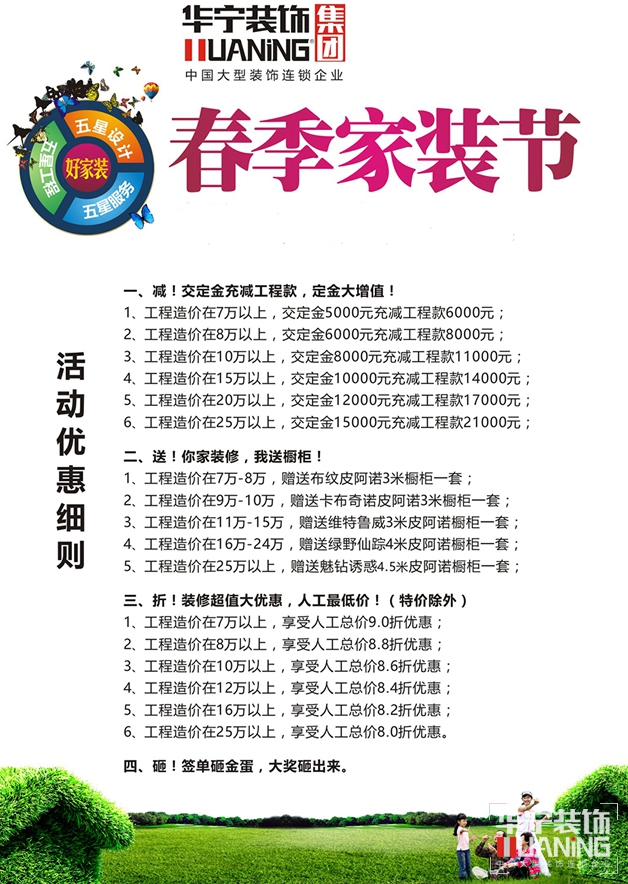 3月是一年中家裝的最好時機(jī),準(zhǔn)備全面啟動愛家裝修計劃的你,若想在眾多家裝公司的促銷中“一劍封喉”,那就關(guān)注華寧裝飾集團(tuán)。春季家裝節(jié),解決所有問題,報名參加,馬上開啟只屬于你的家裝愜意之旅。