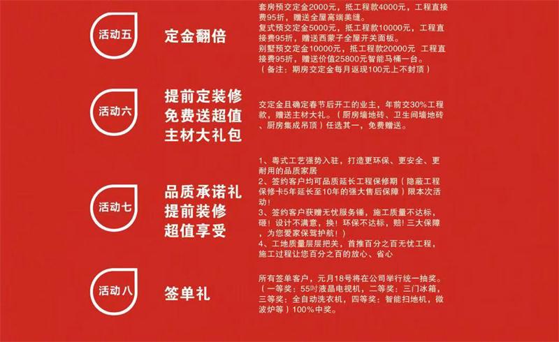 交定金且確定春節(jié)后開工的業(yè)主,年前交30%工程款,贈送主材大禮。(廚房墻地磚、衛(wèi)生間墻地磚、廚房集成吊頂)任選其一,免費(fèi)贈送。
