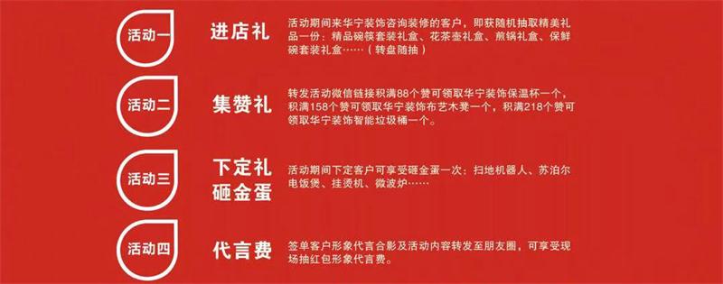 活動期間來華寧裝飾咨詢裝修的客戶,即獲隨機(jī)抽取精美禮品一份:精品碗筷套裝禮盒、花茶壺禮盒、煎鍋禮盒、保鮮碗套裝禮盒……(轉(zhuǎn)盤隨抽)