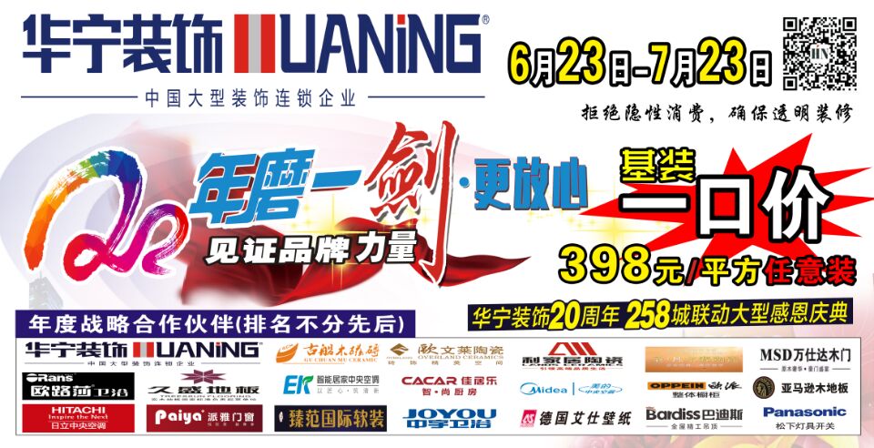 廣東華寧裝飾集團(tuán)進(jìn)駐柳州11年,全國連鎖,辦公室自主產(chǎn)權(quán),現(xiàn)因總部創(chuàng)立20周年,全國258城大聯(lián)動,裝修一口價,398元/平方,任意裝!名額有限?。〕杀緝r感恩回饋新老客戶,只要您來,就會有意想不到的收獲?。?/span>