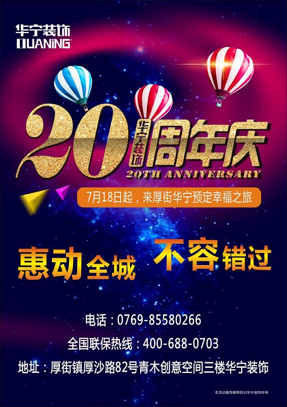 為慶祝廣東華寧裝飾集團成立20周年,華寧東莞厚街分公司將于本月18號至本月30號,開展為期12天的惠民酬賓大活動!“六重好禮”送不停,快和您的家人們進店訂制一份屬于您的裝修幸福之旅吧!