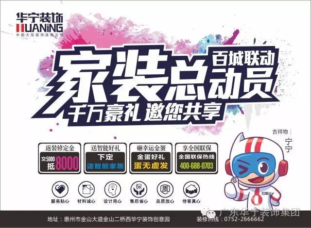 查看詳情鉅惠! 2016年的夏季,沸騰的不只是炎炎烈日,華寧裝飾以“家裝總動(dòng)員”為主題活動(dòng)全面啟動(dòng),全國(guó)門店響應(yīng)聯(lián)動(dòng),讓您感受到席卷華夏大地的裝修熱潮;將給您帶來(lái)全新的家裝體驗(yàn),華寧鑄家,為您的家保駕護(hù)航!