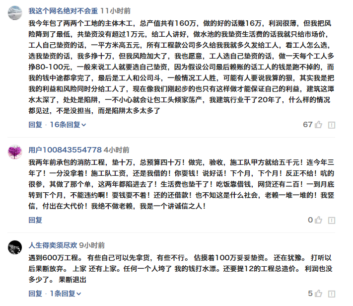 因此,很多踩過這個坑的包工頭都不愿意接墊資工程,再大的利潤也不干。