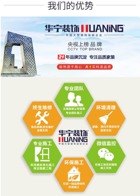 華寧裝飾集團(tuán)作為全國(guó)大型連鎖品牌,目前在全國(guó)范圍內(nèi)開設(shè)分公司300余家,CCTV上榜品牌,專業(yè)品質(zhì)家裝21年,全國(guó)聯(lián)保400售后服務(wù)保障熱線,標(biāo)準(zhǔn)化的施工工藝,健康品質(zhì)環(huán)保的一線品牌用料,專業(yè)監(jiān)工施工團(tuán)隊(duì),讓您裝修放心,入住舒心。