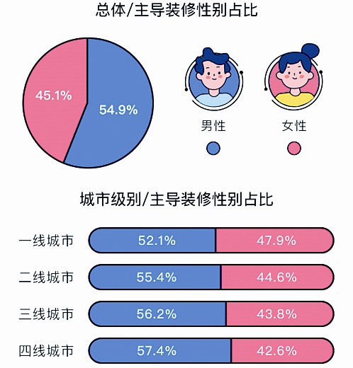裝修是安家的必要步驟,與每個(gè)人都息息相關(guān)。《報(bào)告》顯示,家庭中主導(dǎo)裝修的以男性為主,占比為54.9%,稍高于女性的45.1%。