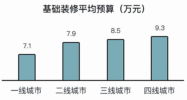 在預(yù)算方面,北上廣深一線城市的基礎(chǔ)裝修平均預(yù)算要比四線城市低至少2萬元,平均預(yù)算只有7.1萬元,二線城市接近于7.9萬元,三四線城市分別為8.5萬元和9.3萬元。