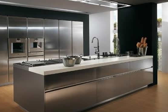 其實不然,現(xiàn)如今的不銹鋼櫥柜產(chǎn)品,無論從鍛造工藝或者外形設計上都表現(xiàn)出其他品牌沒有的潛力,成為打造后現(xiàn)代風格廚房的“法寶”。曾經(jīng)給人以“冷冰冰”印象的外觀得到了很大改善。不少品牌利用不銹鋼極強的金屬感,推出了后現(xiàn)代風格的整體設計產(chǎn)品。線條簡約,同色系水槽、灶具、抽油煙機甚至焗爐和冰箱嵌入其中,渾然一體,還營造出空間的開闊感。此外,不銹鋼櫥柜柜體由雙面組成,整個柜由整塊材料一次沖壓,一體化成形,柜體找不到一個焊點和螺絲釘。而且,不銹鋼臺面與水槽焊接成為一體,無需封邊也無邊縫,很好起到防水不滲漏、防蟑蟲的作用。