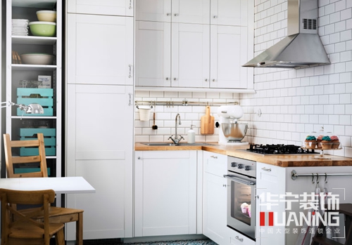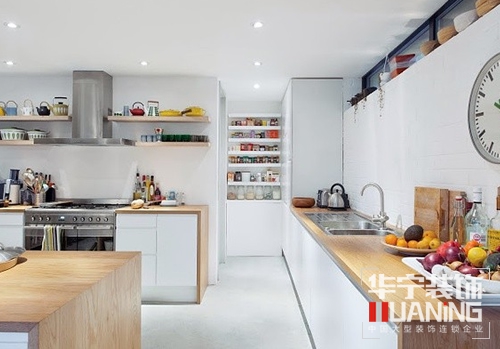 廚房的使用面積要適中,過大無疑浪費(fèi),而過小則擁擠不堪,合理面積應(yīng)一般為為 10平方米左右。還要保證廚房空間的自然采光和合理通風(fēng)。廚房若面積夠大,可放置小型餐桌,這樣就能兼作飯廳使用,無須另覓空間作為飯廳,餐桌下可放置地毯以作分隔空間之用。廚房面積若是小,則應(yīng)該注意收納。