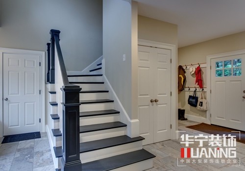 為避免木制踏步板在使用一段時間后出現(xiàn)局部的嚴重磨損,可在樓梯廊道中央踏步上鋪設一條地毯。這樣不僅起到保護樓梯的作用,還可以在某種程度上點綴一下整個空間。