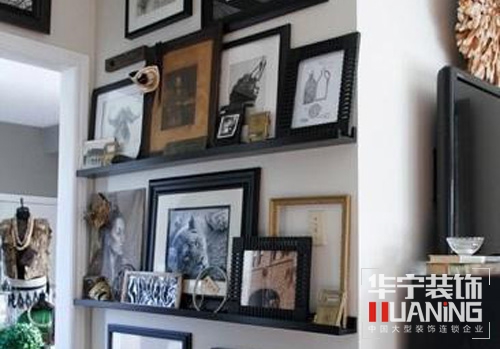 如果不太了解照片墻的構(gòu)成法則,擔(dān)心貼得歪七八扭不好看的話,最實用的做法就是給墻面做個置物架。單層板做成一個簡單的陳列架,將照片、裝飾畫按次序擺放上去也不失為一種可取的做法。