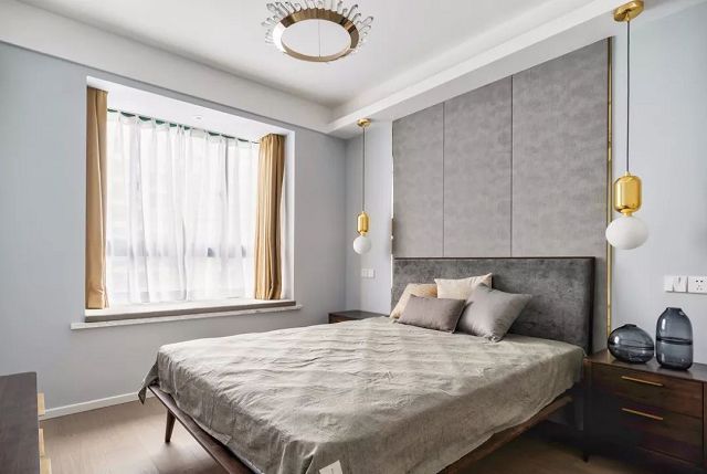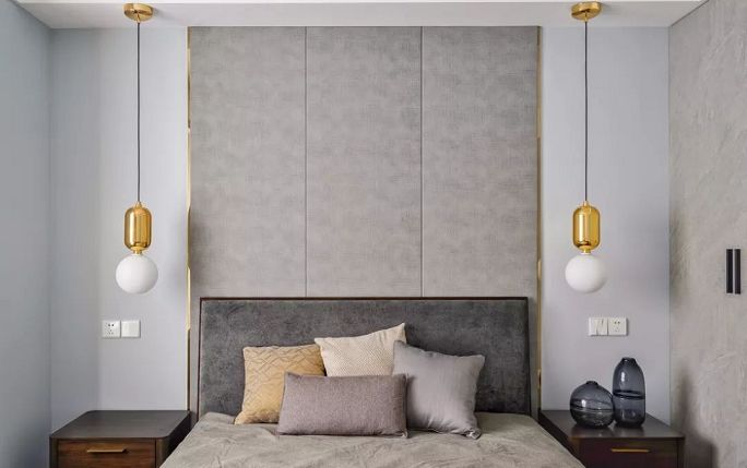 ▲臥室,淺灰色硬包,在金色不銹鋼條之間更顯質(zhì)感。