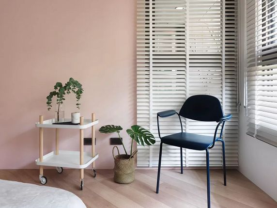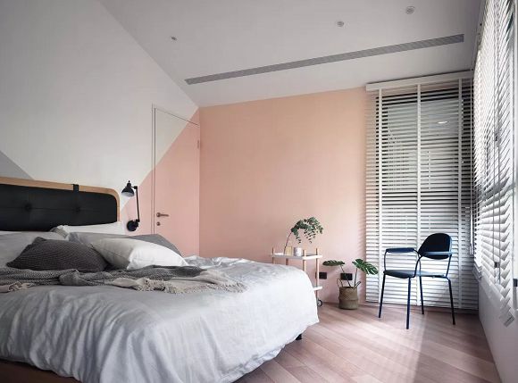 ▲臥室的白色和粉色撞色墻面,很大氣,再加上木質(zhì)斜紋人字形鋪滿的地板,很時尚高檔。