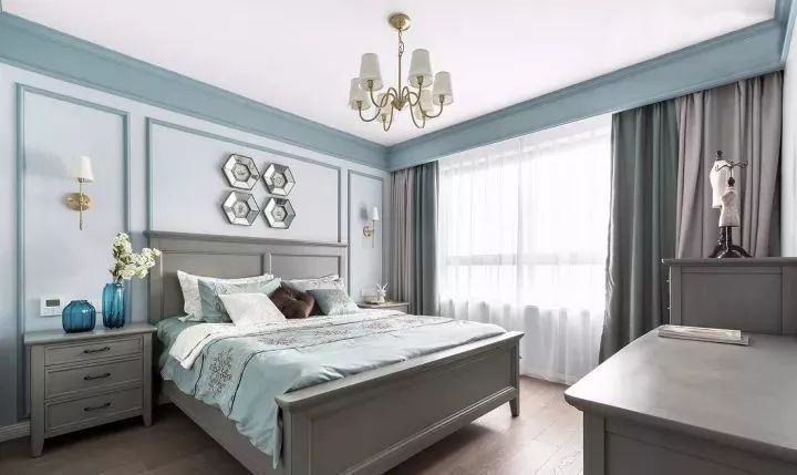 ▲淡藍色的臥室可以安撫身心的疲憊,淡藍色的墻面搭配灰藍色的美式家具,優(yōu)雅而清新。