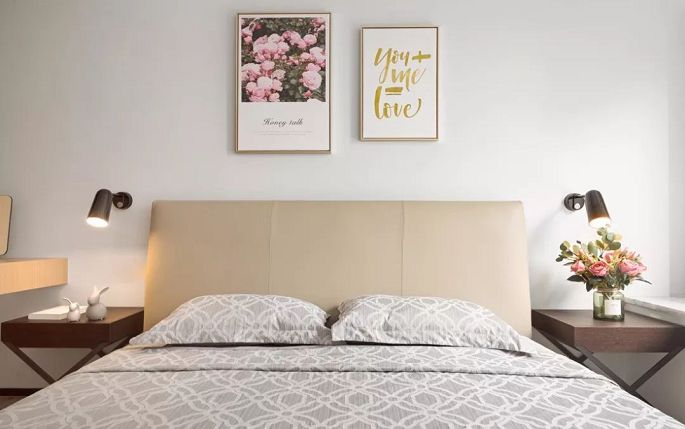 ▲臥室碎花床頭墻兩邊做有邊框造型,契合了床頭柜和壁燈的布置,給人落落大方的既視感。